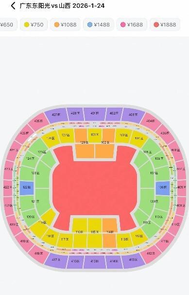 有媒体截图发布广东队主场的票价情况,主场对阵山西队,我们看到区间为500、600、650、750、1088、1488、1688、1888,达到8种价格。